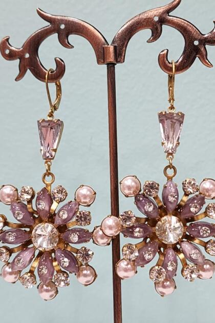 Pink and Purple Rhinestones and Pearls Teardrop Earrings