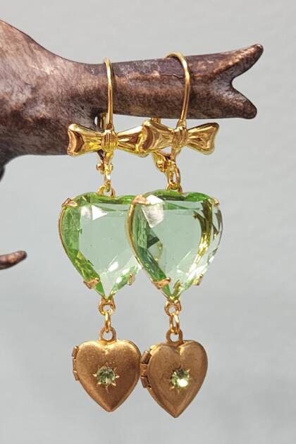 Green Crystal Heart and Tiny Brass Locket Earrings