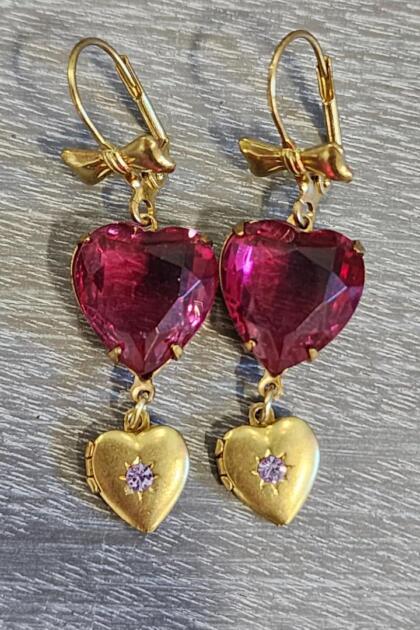 Pink Crystal Heart and Tiny Brass Locket Earrings