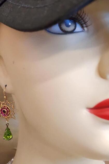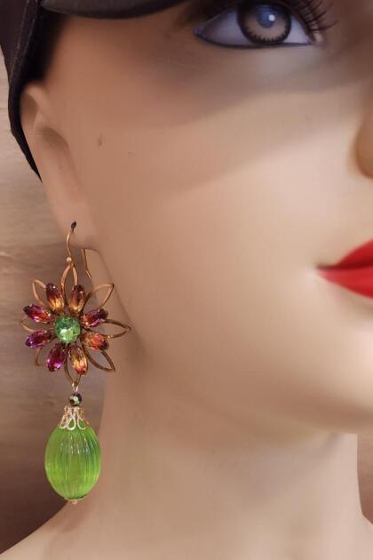 Green Crystal Heart and Tiny Brass Locket Earrings