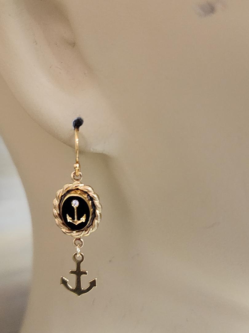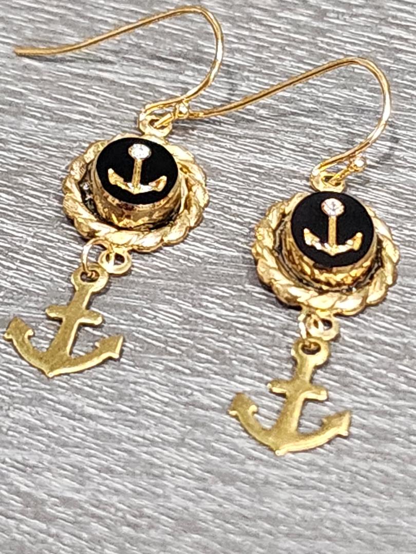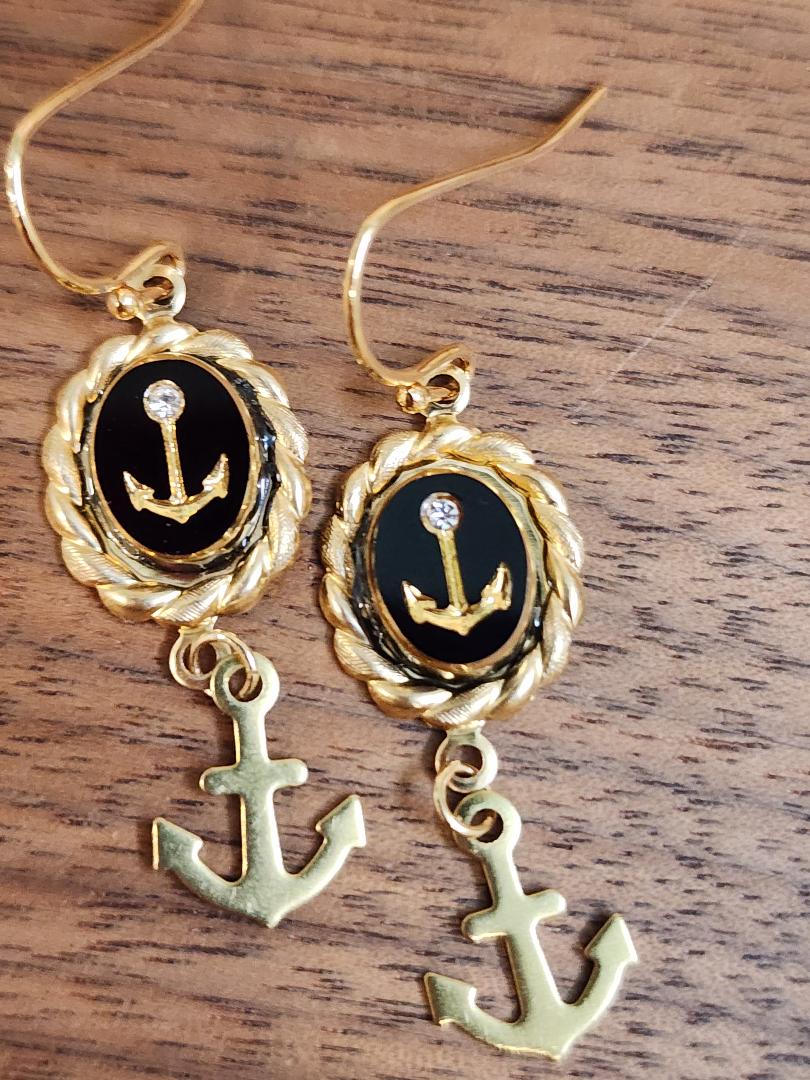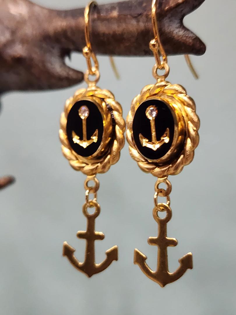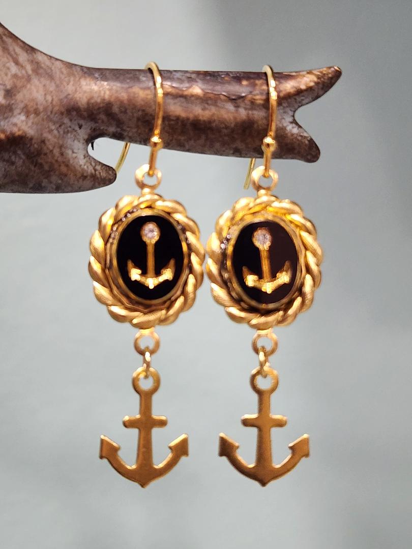 These nautical earrings are perfect for someone who loves boating, sailing or is a preppy poser. The black cabochons are vintage German glass from the 1960’s. They have a little rhinestone atop the gold anchor. Dangling from the raw brass oval roped component are shiny flat raw brass anchor charms. The earrings are finished with gold toned brass French ear wires, and the total length of the earrings are approximately 1 and 1/2 inches. Ahoy!