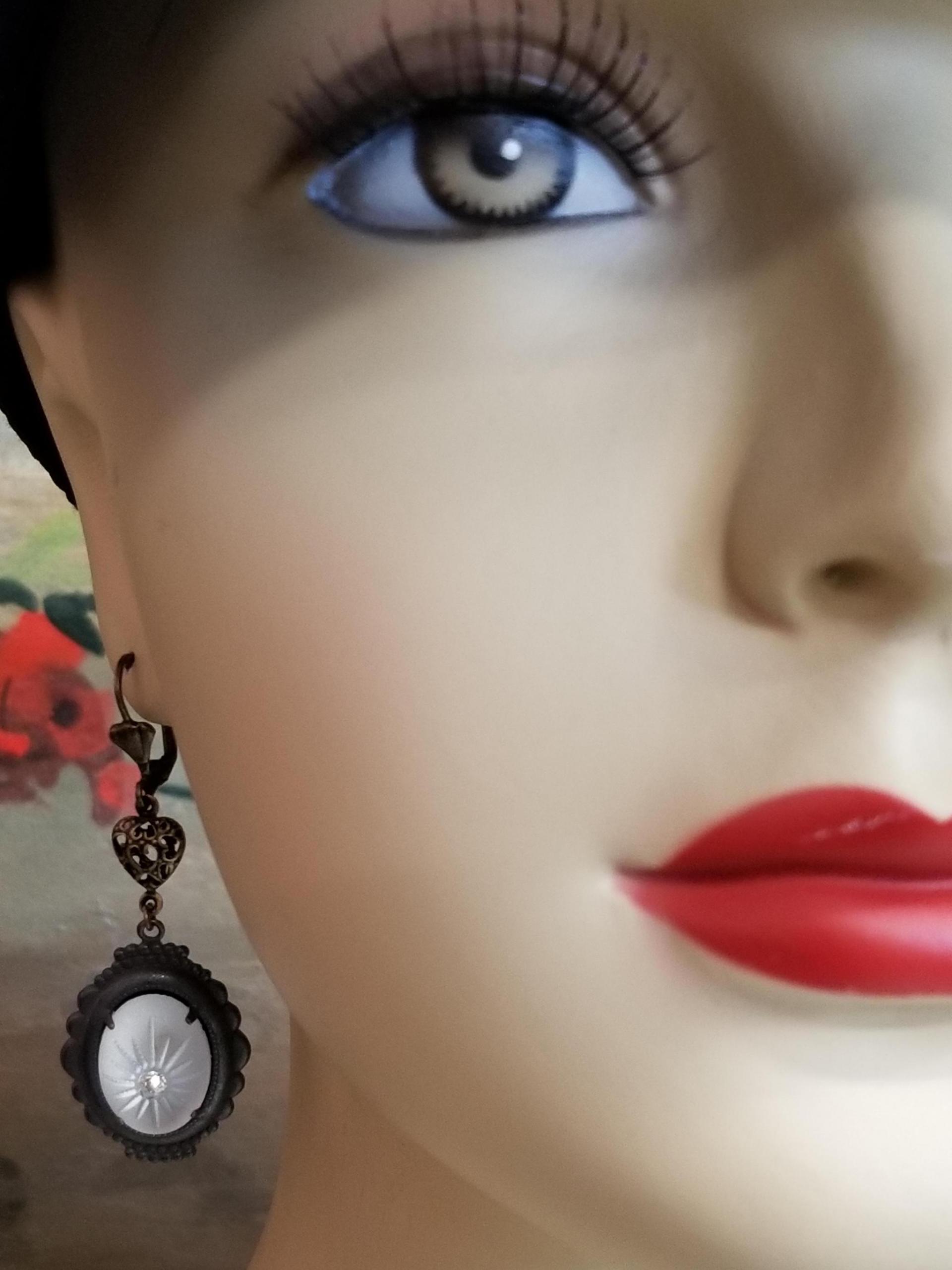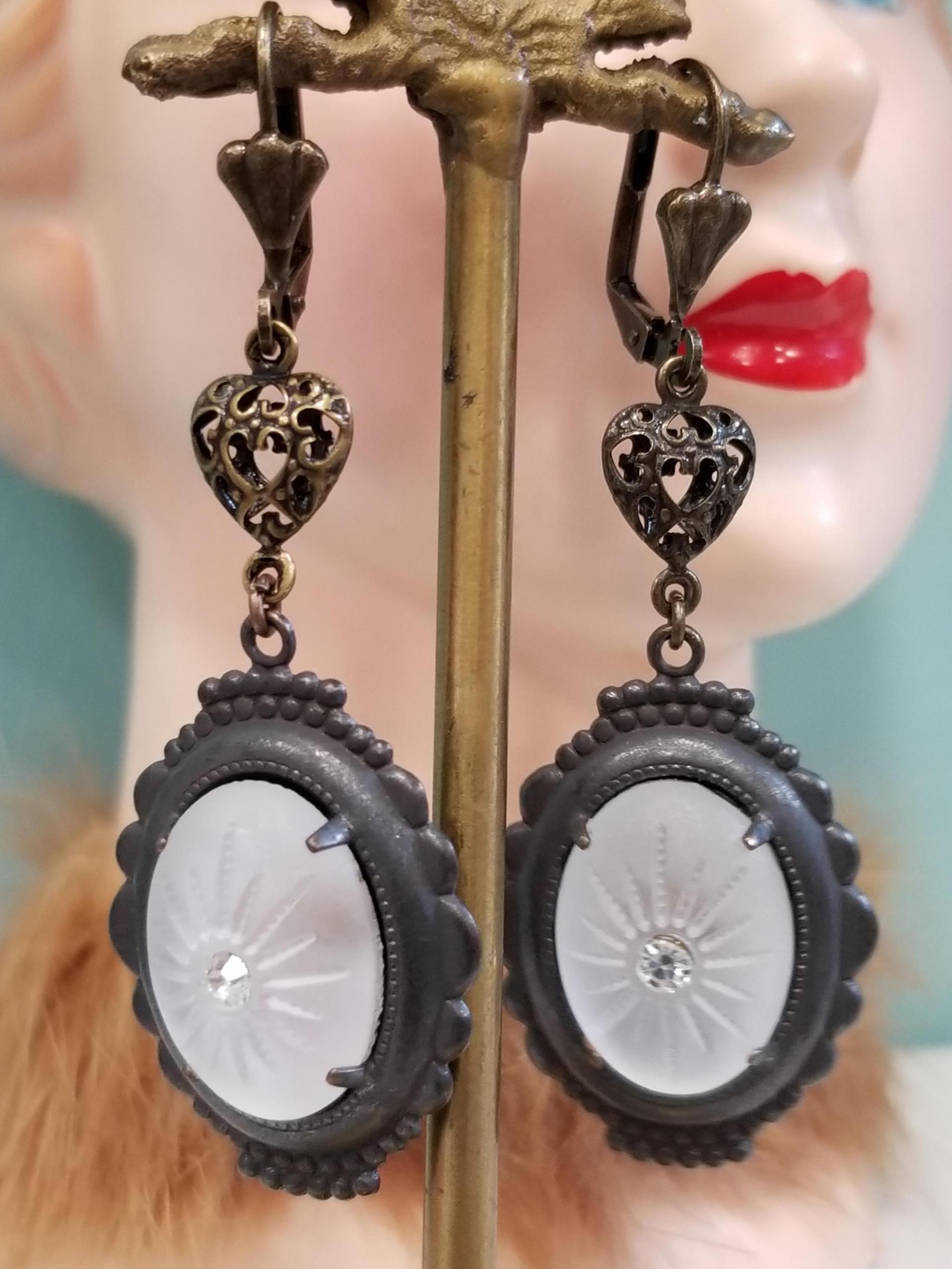 INFATUATION! I love the look of these lightweight Victorian style earrings featuring Baroque style oval frames encapsulating these luminescent, frosted, ribbed white vintage cabochons with tiny crystal rhinestones in the center. The oval frames are attached to beautiful filigree brass oxide hearts. The earrings are finished with antique brass lever back ear wires with little leaves in front. The earrings are approximately 1 and 3/4 inches long in total length.