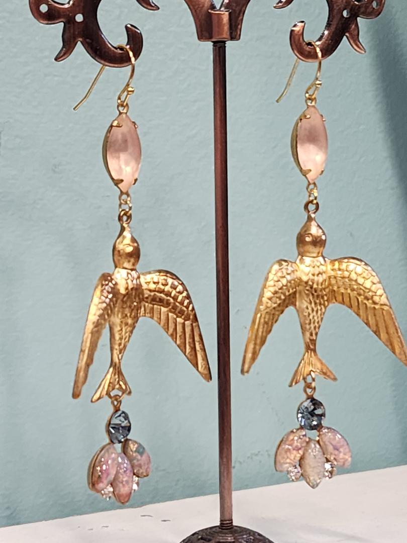 Perfect for spring, these romantic earrings feature a gorgeous raw brass sparrow ascending upwards towards vintage matte pink rosaline navette stones set in brass settings. Hanging beneath the 1 and 1/2 inch bird are a cluster of fire opal glass stones masquerading as leaves. The earrings are finished with brand new gold-toned (nickel free) French style earwires. These long earrings are of medium weight measure a little more than 3 and 1/4 inches in total length. Please see mannequin photo for size reference.