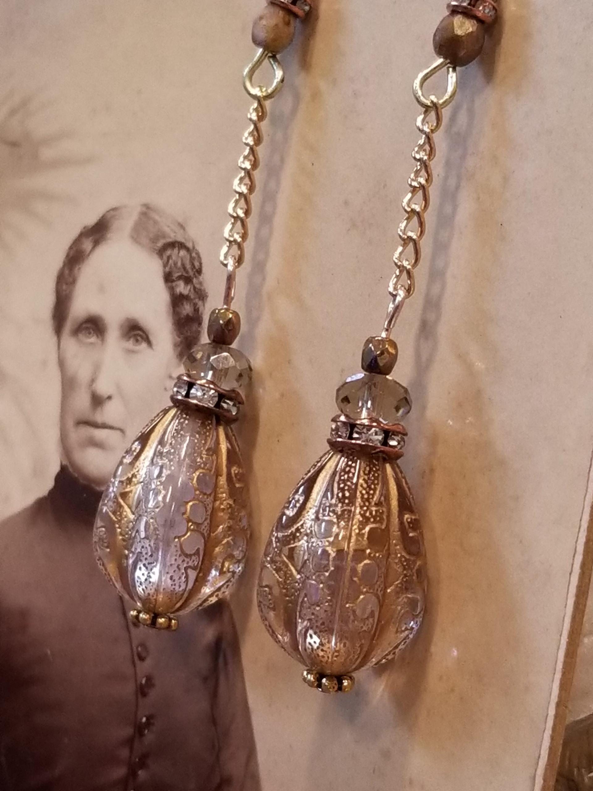 These earrings are the enemy of a bland tan outfit. An ornate, ribbed, etched acrylic teardrop shaped bead (measuring 18 x 13 mm) delicately hangs from a gold toned chain. The earrings are finished with gold toned (nickel free) hardware and Czech glass beads. The total length of the earrings is approximately two and 3/4 inches. These are rather lightweight and look amazing on the ear.