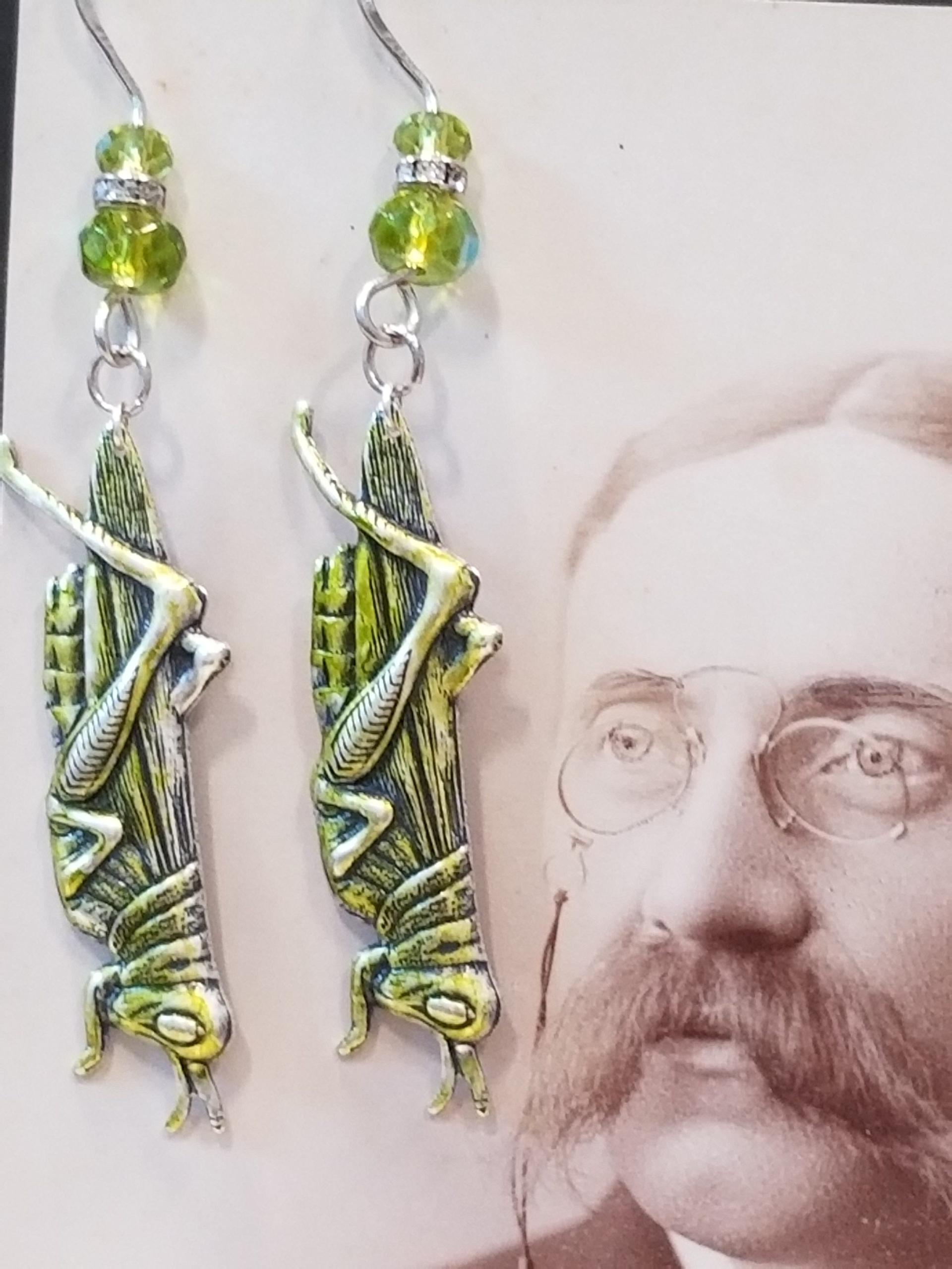 Grasshoppers are very underrated. If humans could leap as far as grasshoppers, relative to size, then humans could jump beyond the length of a football field! These brass based grasshoppers were given a peridot green colored tint and adorned with glass Czech beads and silver plated hardware. The grasshoppers, themselves are 1 and 1/2 inches long and the earrings are a total length of 2 and 3/4 inches in length.