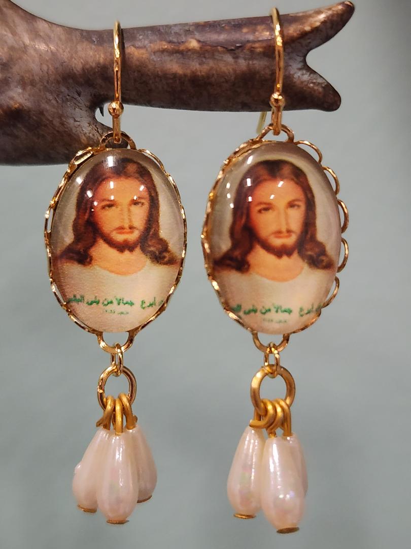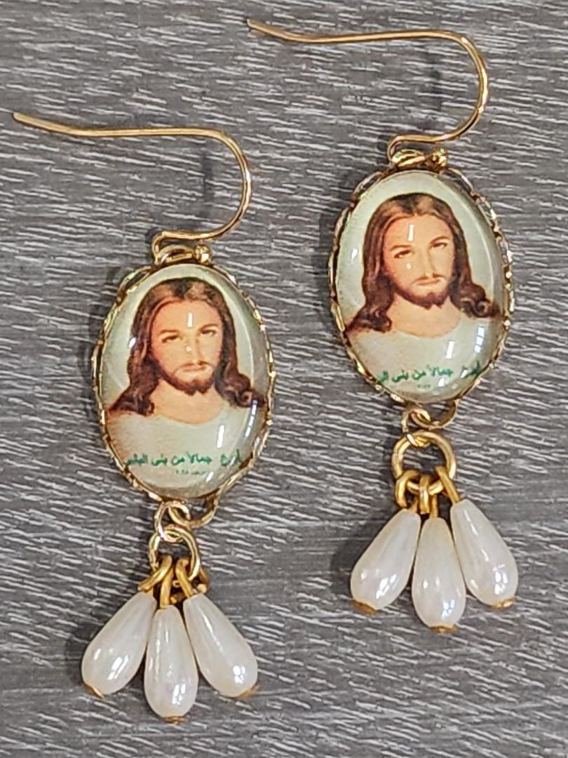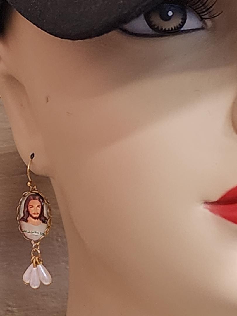 The Jesus Cameo glass dome cabochons are set in oval gold-toned brass settings and have little triplet Japanese pearls which are vintage from the 1960’s. These medium weight earrings are finished with gold toned French style brass ear wires. The earrings have a total length of approximately 1 and 3/4 inches.