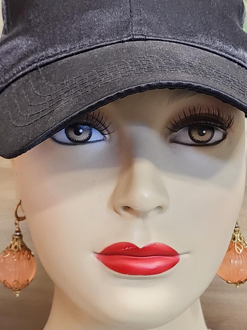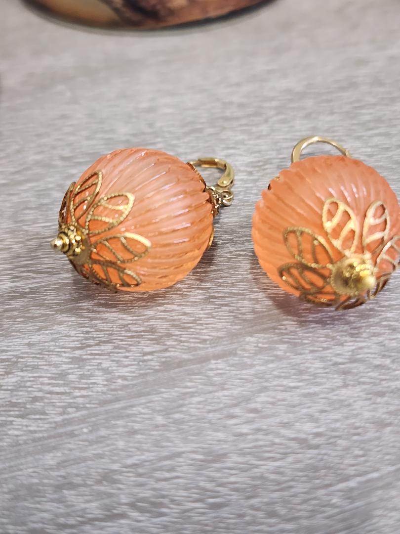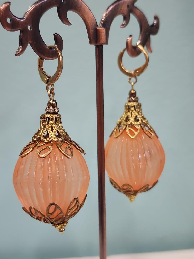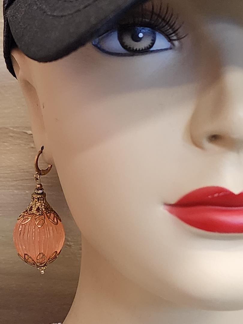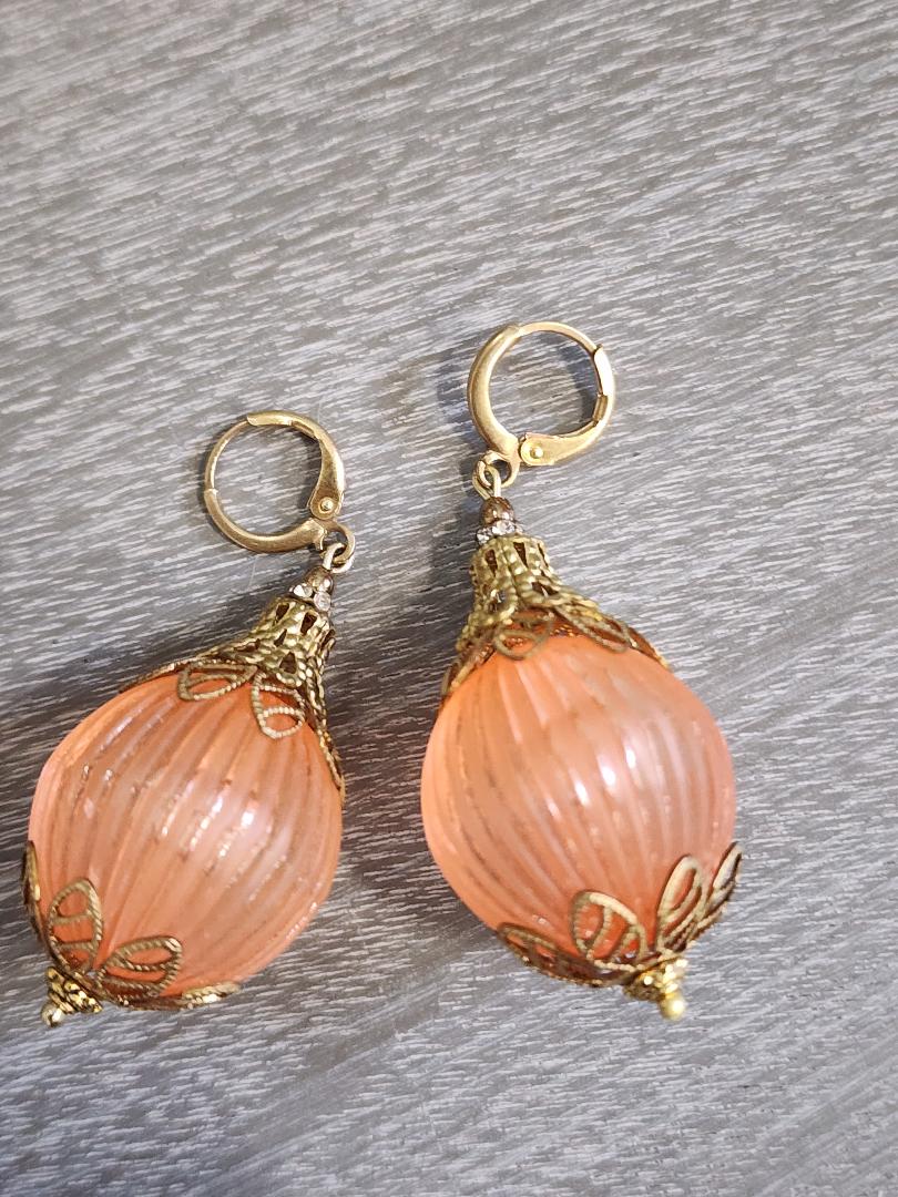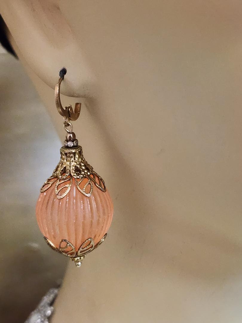 I couldn’t decide if this belonged in the ‘Elegant Earrings’ section or if it would be in the “Fun and Unusual’ section. I chose the latter because of the large size of the beads and the fact that they are acrylic and not glass. These slightly translucent, but ironically frosted, cantaloupe melon colored balls are vintage from the 1960’s. The ribbed spheres are made of Lucite and are almost an inch across in diameter. They are capped with antique toned brass bead caps that look little crowns and are finished with brand new gold-toned (nickel free) lever back ear wires. These medium weight earrings have a total length of approximately 2 and 1/4 inches. Please see mannequin picture for reference.
