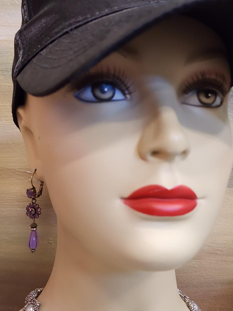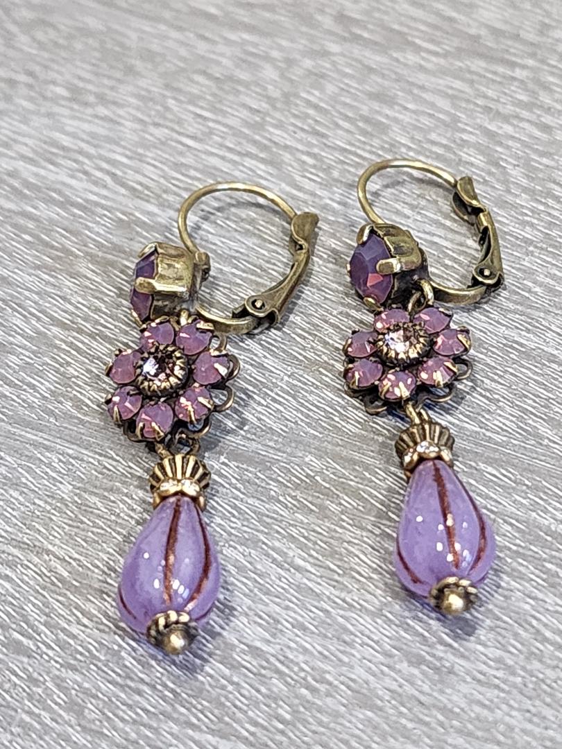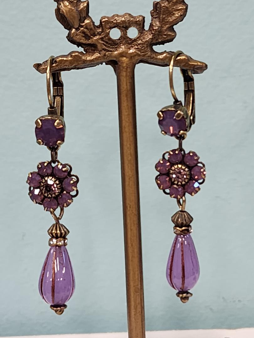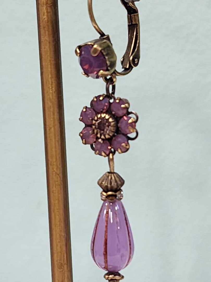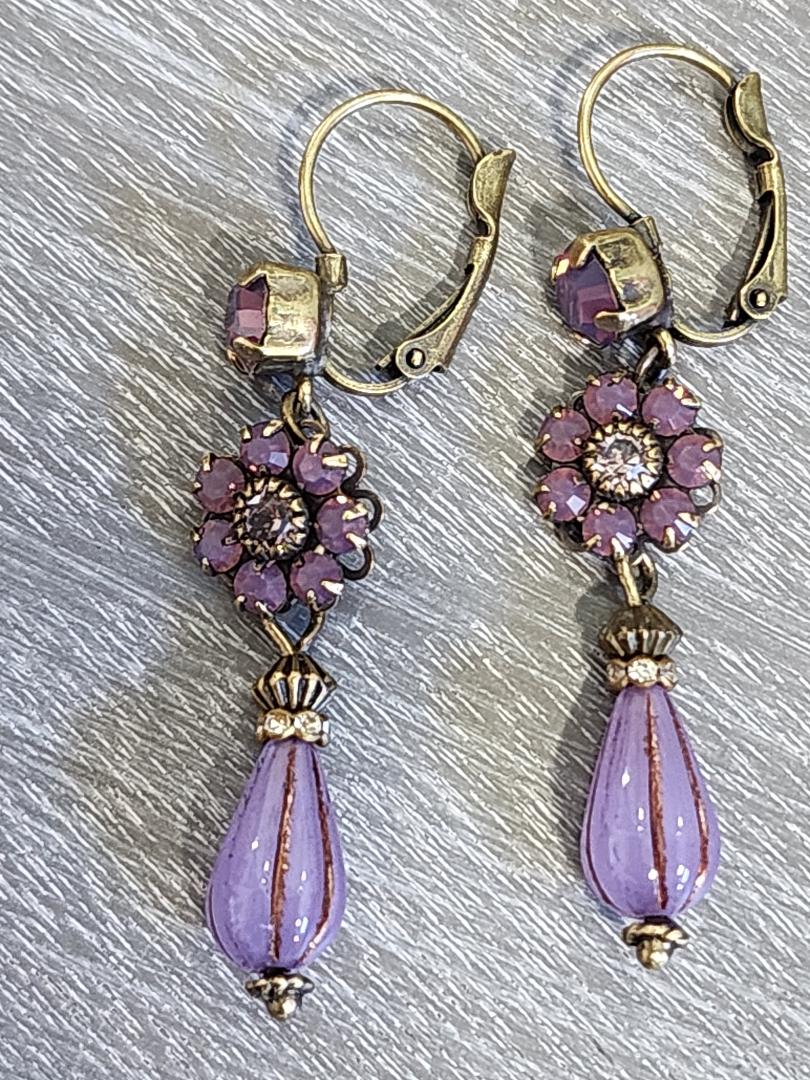 Stunning! It is so hard to capture the color of these beautiful, new Swarovski stones. These Cyclamen Opal stones are a milky purple for lack of better words…LOL… but they shine and sparkle due to the faceting of the stone. The filigree component is approximately 1/2 in across in diameter. Hanging beneath are cloudy lilac ribbed tear drop Czech stones topped with a rhinestone spacer bead and antique brass toned bicone bead. The earrings are finished with brand new antique gold toned (nickel free ) lever back ear wires with Cyclamen Purple Opal Stones attached to the ear wire. The total length of the earrings are approximately 2 inches. Please see picture of mannequin for reference. (These flower heads are smaller than the typical Swarovski flower head component.)
