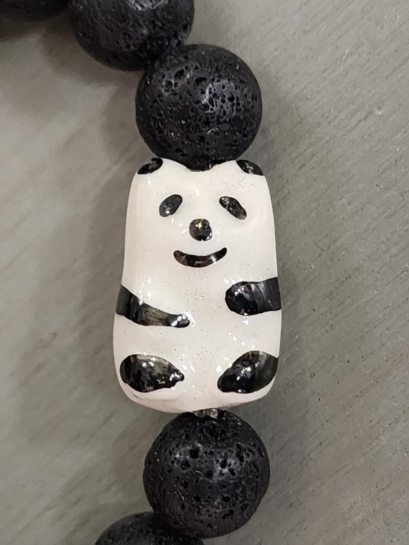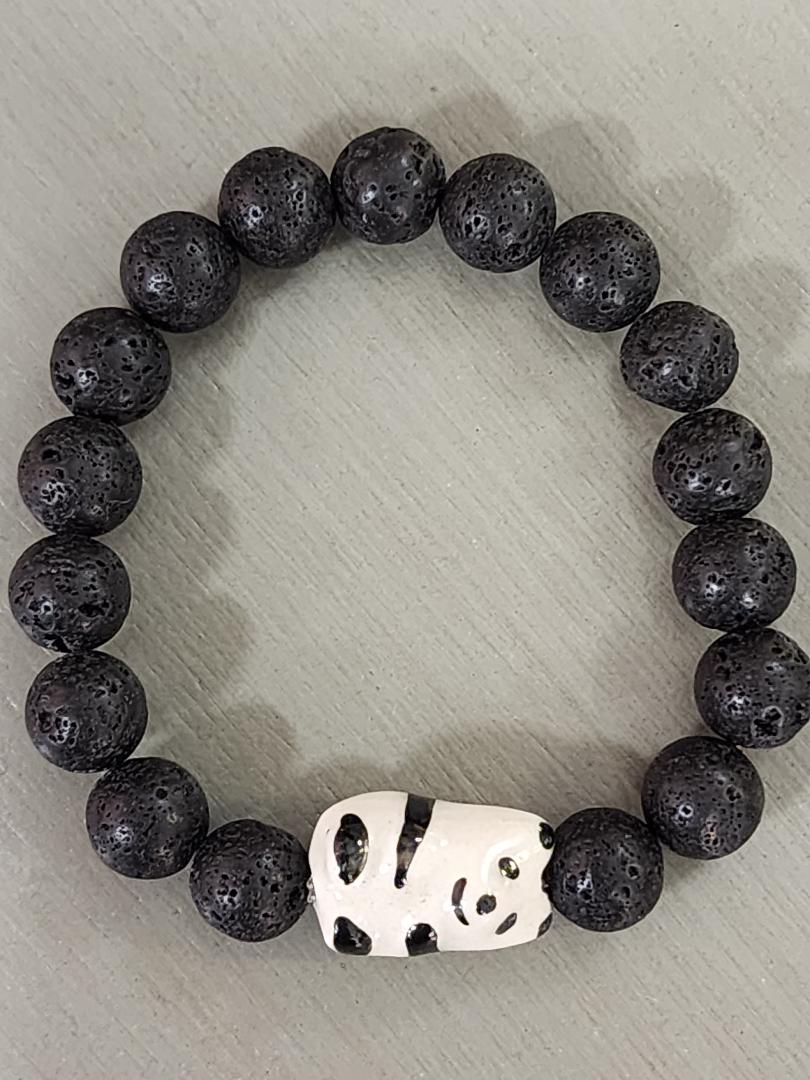 This whimsical bracelet features a black and white porcelain panda surrounded by black lava beads. This is a stretchy bracelet, so it fits a small and average wrist. Send me an email if you need a custom size.