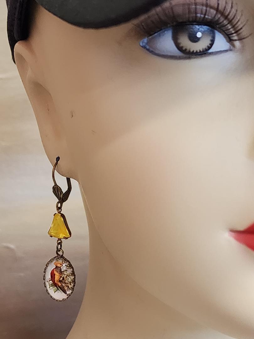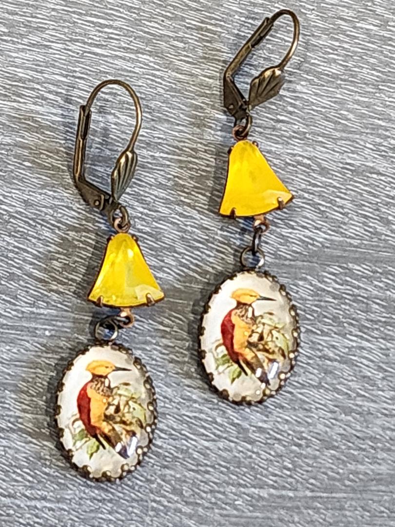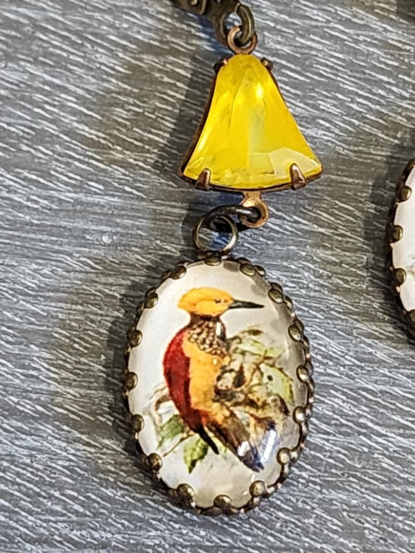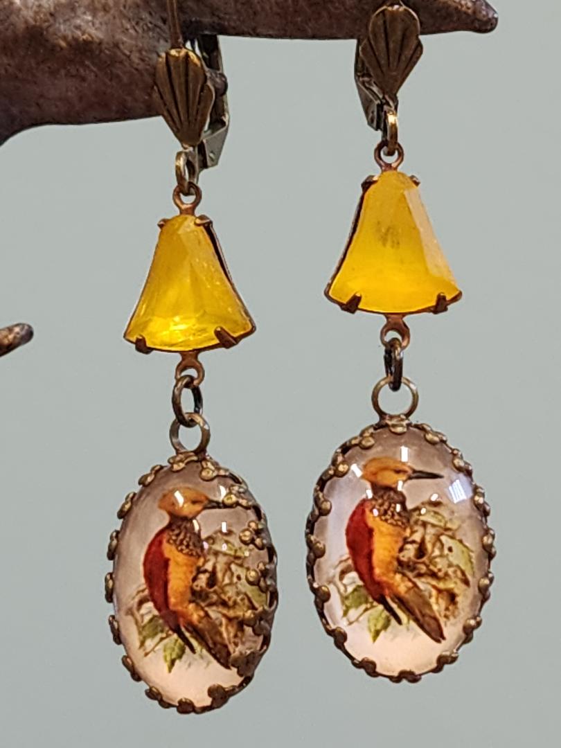 These vintage style woodpecker earrings are the perfect purchase for any bird lover. The oval glass cabochons are set in an antique brass toned setting and are dangling from vintage matte yellow gems set in a brass oxide bell shaped setting. The earrings are finished with (nickel-free) antique brass toned lever back earwires with little shells on the front. The total length of these earrings is approximately 2 inches.
