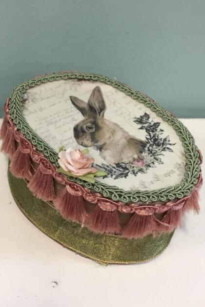 Folk Art Painting of Lady with Feather Bunny Ear Bonnet and Bird Decorative Box